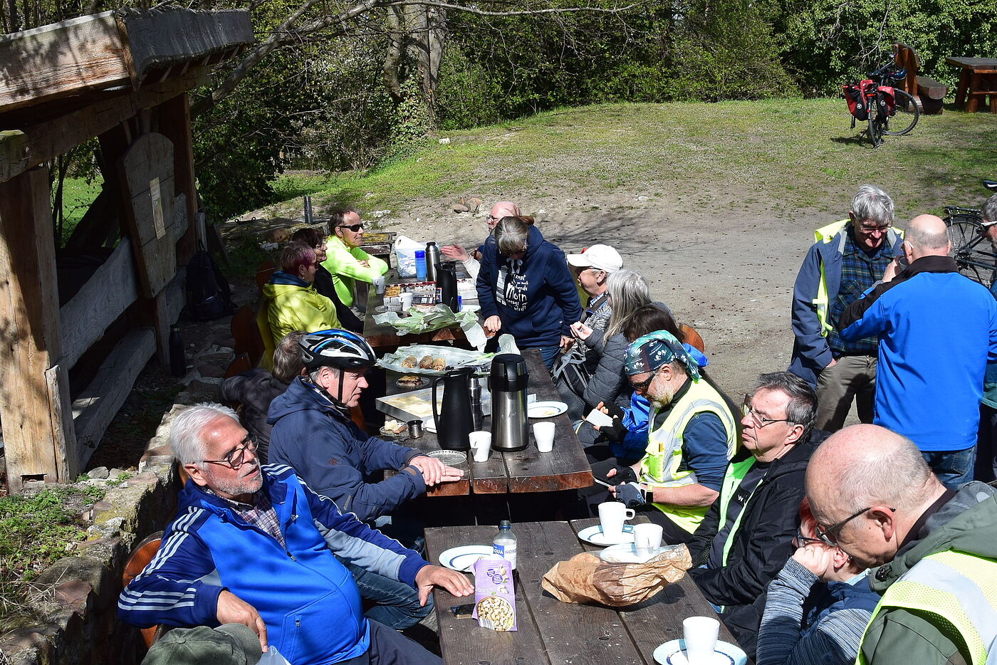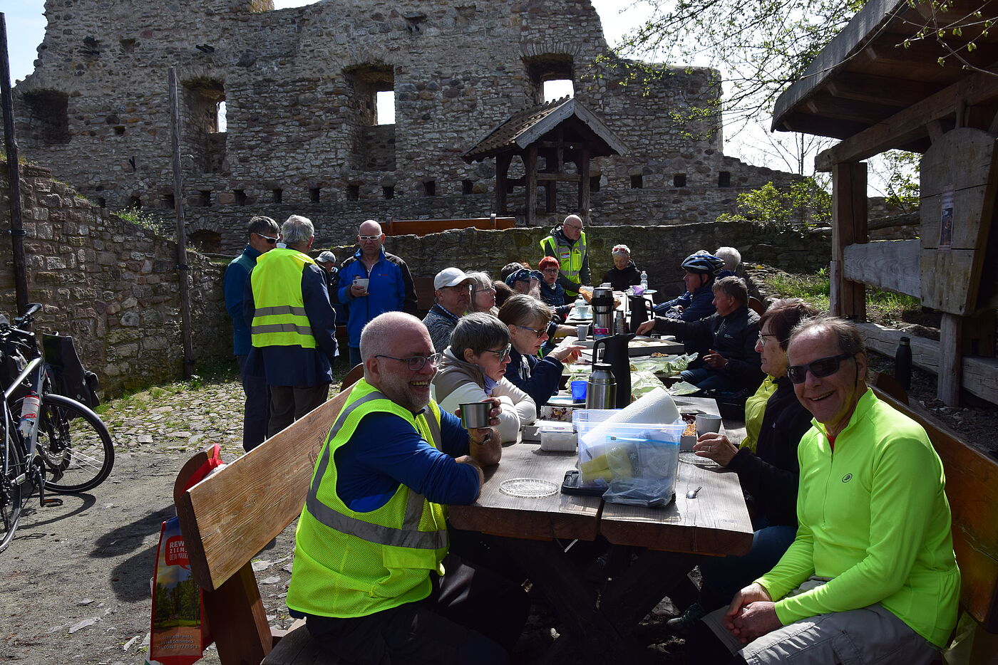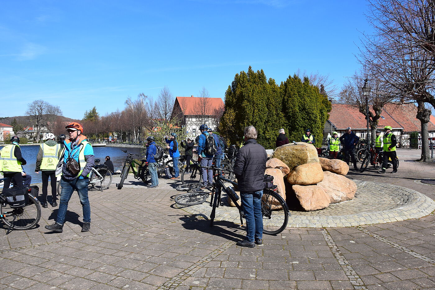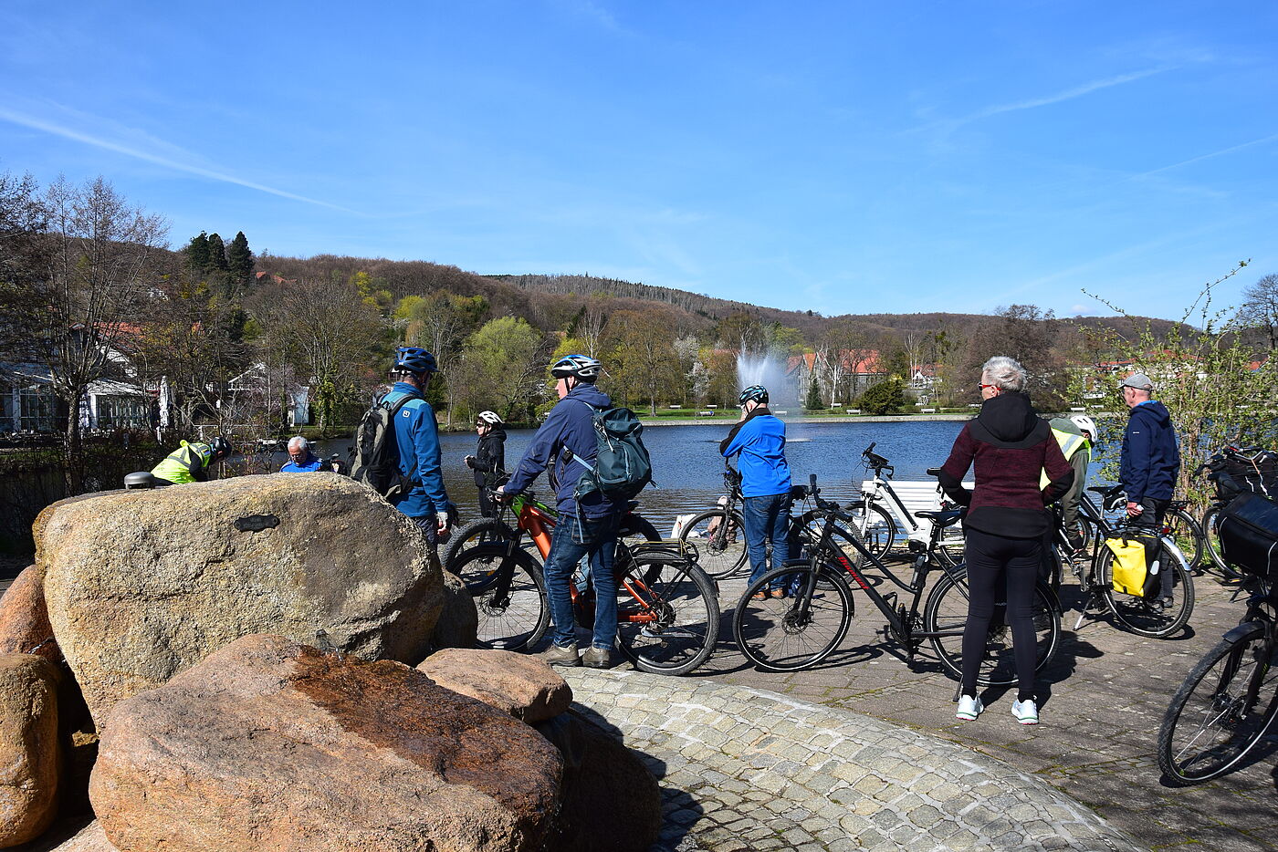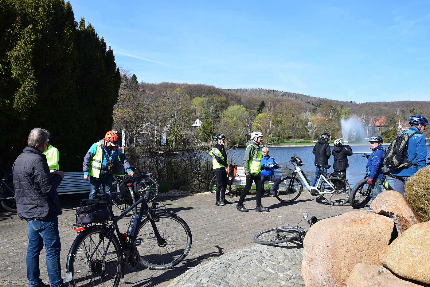 Mit einem gemütlichen Einrollen verließen wir über das Wohngebiet Charlottenlust das Stadtgebiet von Wernigerode in Richtung Westen, um über Darlingerode, Drübeck unsere erste Trinkpause am Forellenteich in Ilsenburg zu erreichen. Strahlender Sonnenschein machte dieses schöne Naturparadies noch imposanter. Nach dem Auftanken der Flüssigkeitsreserven ging es über die Kastanienallee am Waldrand Richtung Jungborngelände. Dort gab es einen kurzen Abriss zur Geschichte durch einen unserer engagierten Tourenguides. Entlang des ehemaligen Grenzverlaufs radelten wir bis zum Grenzdenkmal Stapelburg, wo es nochmal ein kurzes Innehalten gab, bevor wir den Anstieg zu unserem heutigen Ziel, dem Burgberg mit der Burgruine Stapelburg in Angriff nahmen. Der Ausblick bei wolkenlosem Himmel und dem Ambiente der blühenden Kirschbäume war grandios. Die Aktiven des ADFC Kreisverbandes Ostharz hatten im Schatten der Burgruine ein Picknick vorbereitet. Und so standen nach kurzer Zeit Kuchen eines Wernigeröders Bäckers, aber auch Brezeln und Salami auf den reich gedeckten Tischen. Bei intensiven Gesprächen verging die Zeit wie im Fluge und ich denke, dass alle nicht nur satt vom Essen, sondern auch reich an Austausch und Natureindrücken die Abfahrt vom Burgberg hinab in Angriff nahmen. Über die Forllenteiche und die Grovesmühle streiften wir Veckenstedt, um danach Richtung Ilsenburg wieder die Ortslage Drübeck zu erreichen. Von dort fuhren wir entlang des Ziegenberges, um nach knapp 5 Stunden und circa 35 Kilometern wieder den Marktplatz Wernigerode zu erreichen, wo sich nach einem obligatorischem Abschlussfoto verabschiedet wurde. Nicht aber, ohne zu versprechen, bei der nächsten Tour wieder dabei zu sein. Abschließend möchte ich vor allem unseren engagierten Tourenguides Jörg Berthold und Frank Dömges für die fantastische Planung und Durchführung der Tour danken. Außerdem natürlich auch unseren Aktiven, die bei Einkauf, Transport und Vorbereitung unterstützt haben. Aber natürlich auch ein ganz großen Dank an alle Mitradelnde. Eine sehr diszipliniert fahrende Gruppe, deren Dankbarkeit für uns der Lohn für unsere ehrenamtliche “Arbeit” ist. Wir freuen uns auf die nächsten Touren.