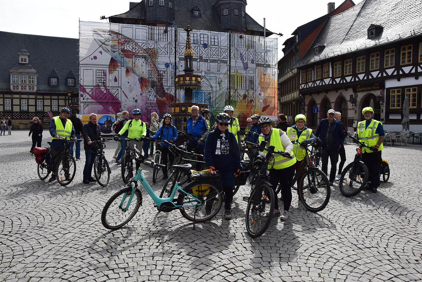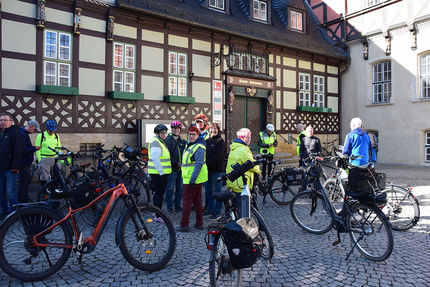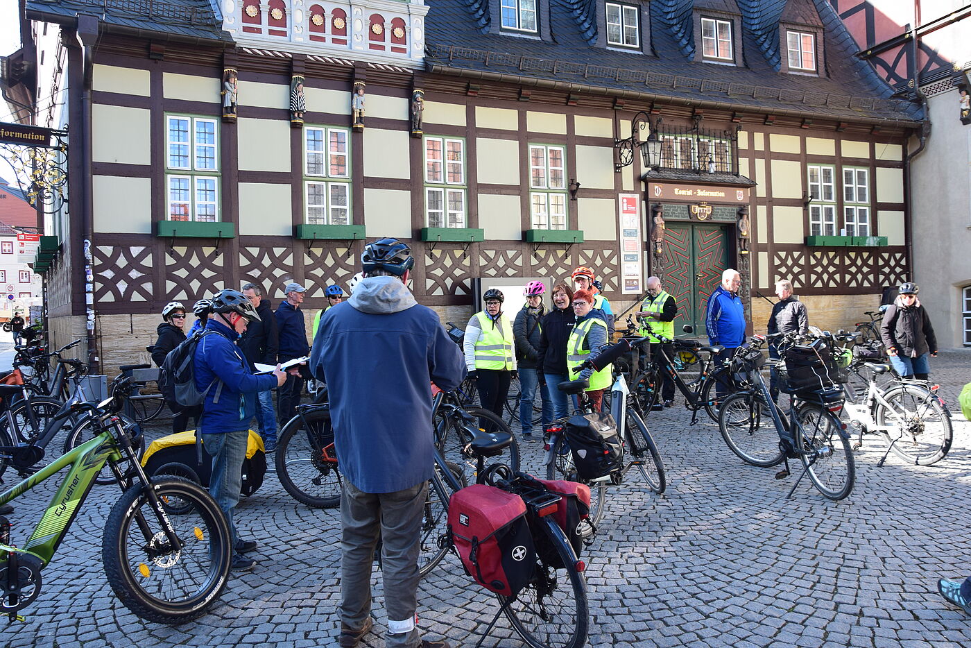 Die Antwort erhielten wir beim Ankommen am Treffpunkt. Neben vielen bekannten Gesichtern, die uns immer wieder auf unseren Radtouren begleiten, entdeckten wir auch Menschen, die durch den gestrigen MDR-Beitrag von unserer Kirschblütenradtour erfahren haben und Lust hatten, aktiv in den Frühling zu starten. Beim pünktlichen Start am Marktplatz in Wernigerode zählten wir insgesamt 24 Teilnehmer. Ein schöner Erfolg, der wahrscheinlich ein Zusammenspiel aus Vorbereitung, Radiobeitrag und der Aussicht auf Burg und Kirschblüte war.
